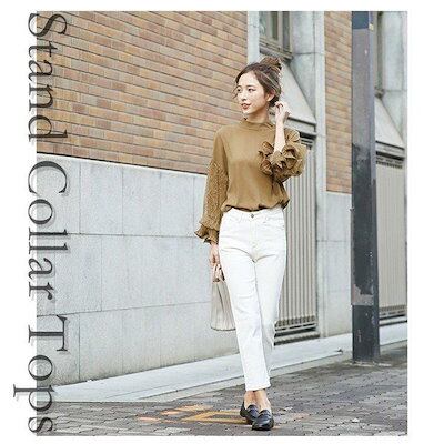 ブラウス レース レディース スタンドカラー フリル ボリューム袖 長袖 シアー プルオーバー