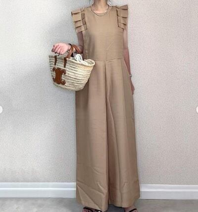 【2枚購入で 2oo円OFF! 】オーバーオール ノースリーブ 木耳縁 オールインワンパンツ ワイドパンツ 着痩せ 体型カバーチュニックキャミワンピース ヘビロテ!キャミワンピース
