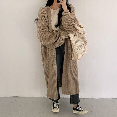 ニットカーディガン レディース ロング丈 長袖 秋冬 アウター ニット カーディガン ゆるカーディガン ニットカーデ 羽織り 大人カジュアル フェミニン 無地 ゆったり ロック ファッション ベージュ