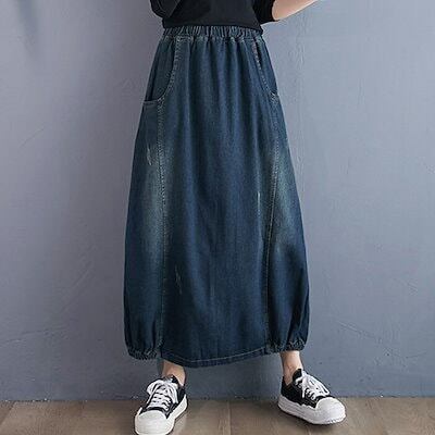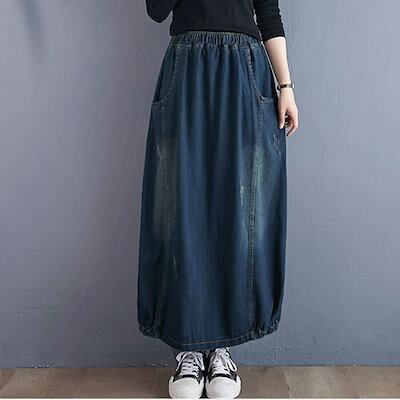 デニムスカート レディース ロング丈 ランタンスカート マキシ丈スカート ユーズド加工 無地 バルーン 美脚 ウェストゴム付き カジュアル おしゃれ 体型カバー 秋 冬 20代 30代