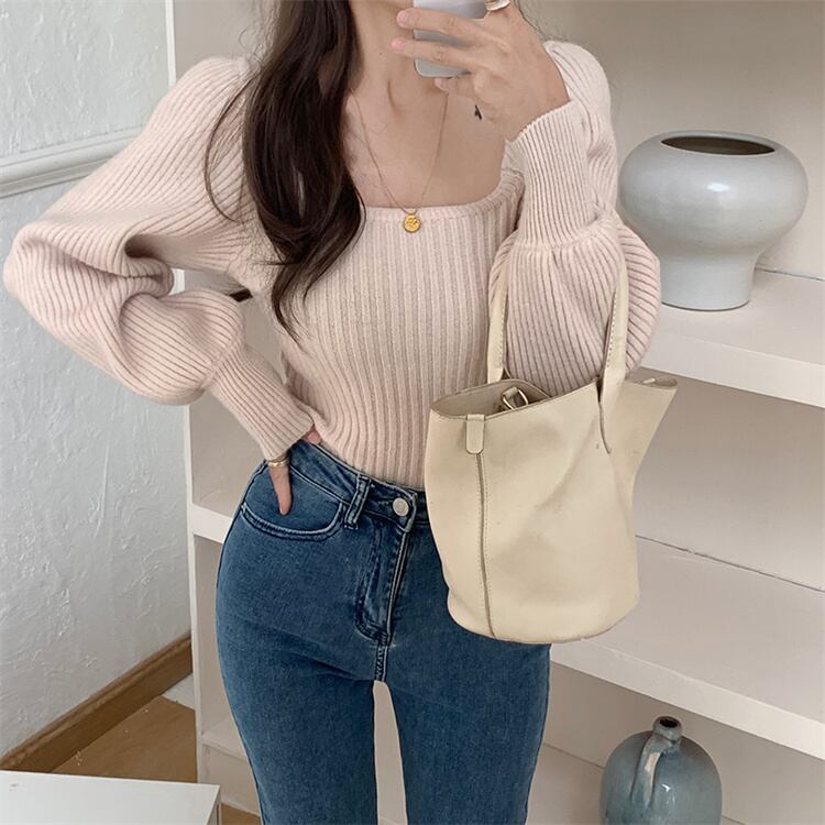 柔らかな雰囲気 スクエアネック レトロ セーター 長袖 秋冬 保温 スリム ニットトップス パフスリーブ