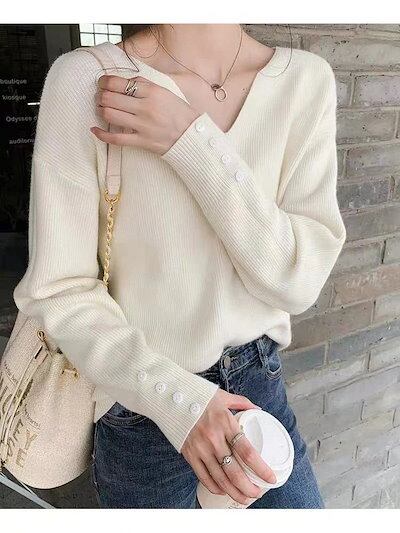 人気なリブニット 秋冬 アンダーウェア おしゃれ Vネック セーター カジュアル ゆったり ベ一シックニット レディース プルオーバーデザイン トップス