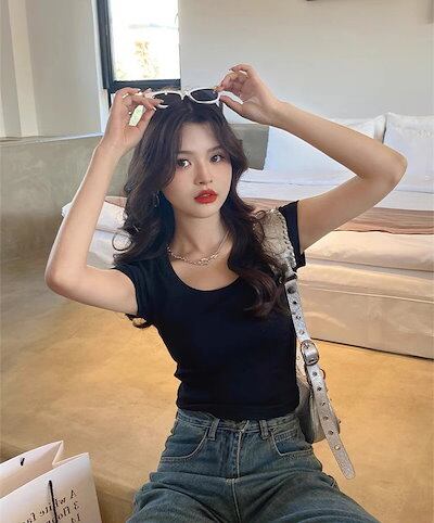 Tシャツ トップス 正肩 Uネックショート丈 トップス 純色 半袖 夏 はスレンダーで痩せて見える レディース 韓国ファッション