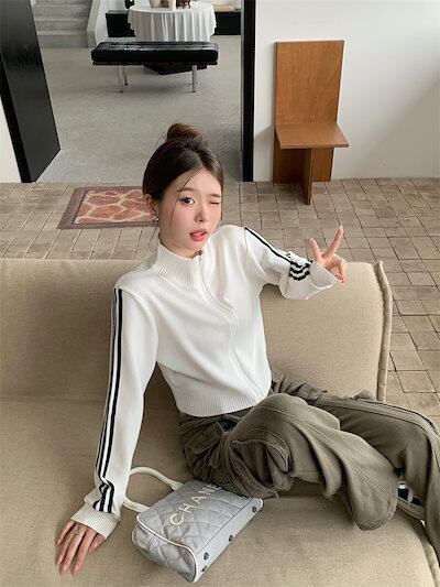2024 秋 韓国 かわいい ニットネック レディース アウター ブルゾン お出かけ ブラック ライトカーキ アウター長袖セクシートップスサイド冬カジュアルファッション系お出かけフル丈トラック
