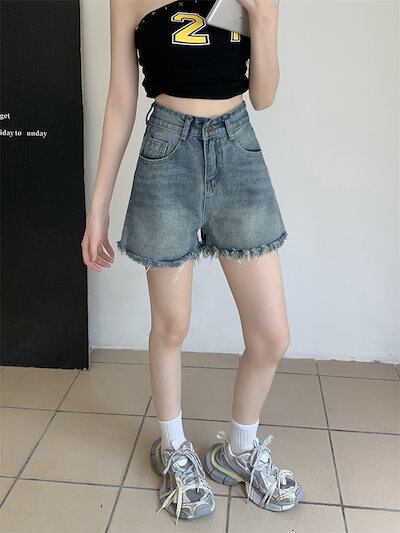 2024 春夏パンツ デニム ジーンズ ショート丈 フリンジ ハイウエスト 美脚効果 脚長効果 細見え 夏 おしゃれ かわいい 韓国ファッション レディース お出かけ