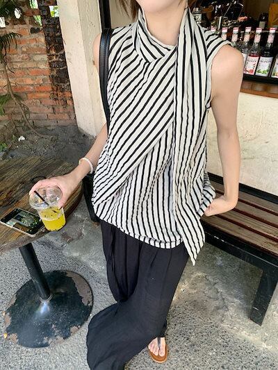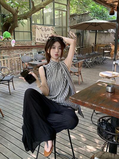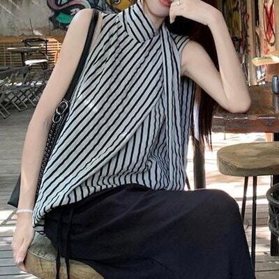 2024夏トップス シャツ ハイネック ストライプ ノースリーブ ゆったり 細見え 夏 黒 ブラック おしゃれ かわいい 大人っぽい 韓国ファッション レディース お出かけ