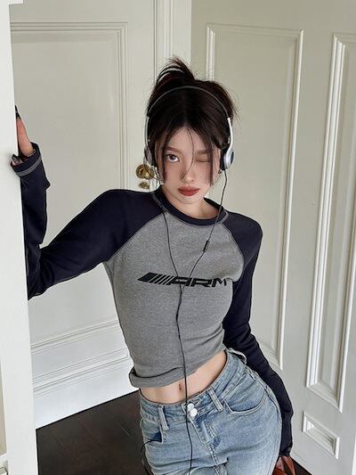 2024春夏 トップス 長袖 可愛い おしゃれ タイトフィット カットソー ラウンドカラー 重ね着丈 スリーブ 女っぽ レディース Tファッション系 フェミニン きれいめ 色っぽ プリント