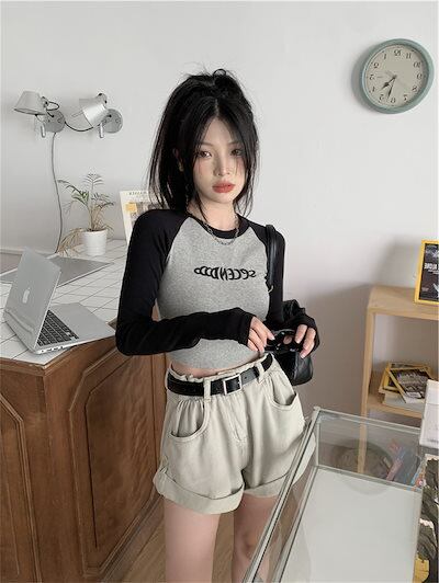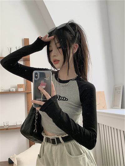 2024夏 韓国 トップス 長袖 可愛い おしゃれ タイトフィット カットソー ラウンドカラー 重ね着丈 スリーブ 女っぽ レディース Tファッション系 フェミニン きれいめ 色っぽ プリント