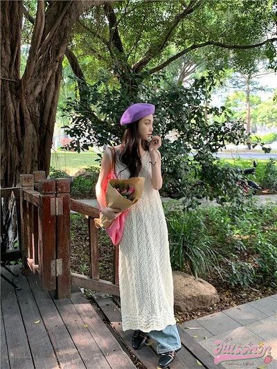 ワンピース ミモレ丈 ジャンパースカート ジャンスカ ノースリーブ Aライン レース 透かし彫り スリット バックオープン 白 ホワイト 春 韓国ファッション レディース おしゃれ かわいい カジュア