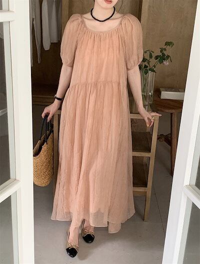 2024 春夏ワンピース ロング丈 半袖 バブル袖 バックオープン Aライン リボン ゆったり 細見え 夏 黄色 カジュアル おしゃれ かわいい キュート 韓国ファッション レディース お出かけ