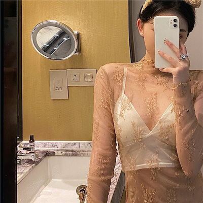 2024 春夏 女度を格上げ tシャツ ファッション ハイネック トップス 薄手 韓国系 長袖 フィット加工 プリント レイヤード 重ね着 肌見せ 女っぽハイフレンチタイト丈 レディース T