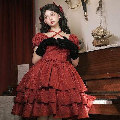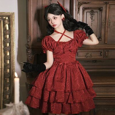 2024 ロリータ ドレス イバラ薔薇オリジナルスカート半袖op赤洋装スカート コスプレ ワンピース ロリータワンピース