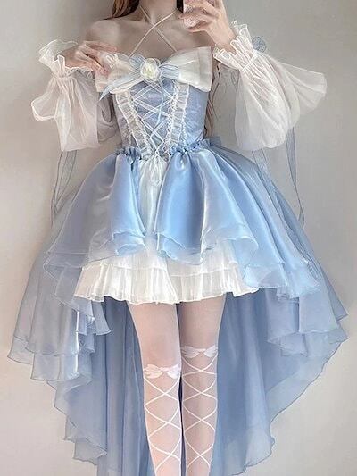 2024 ロリータ ドレス パーティードレス ブルードレス 前短後長 トレーン付き ウェディング風 花嫁ドレス リボントレーン プリンセススカート コスプレ ワンピース ロリータワンピース