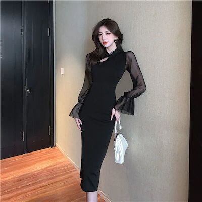 新作 改良 チャイナドレス ドレス 秋冬 長袖 タイトワンピース 着痩せ セクシー 修身 ブラック ロングワンピース