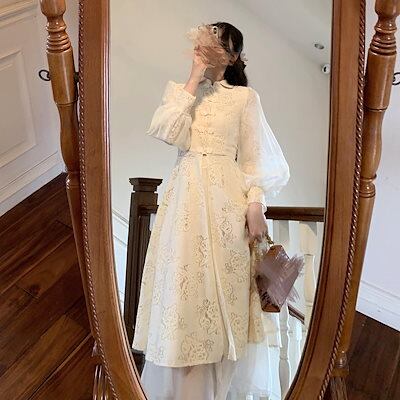 チャイナドレス 改良版 レディース パーティードレス エレガント 気質 長袖 ロングワンピース スカート 2点セット