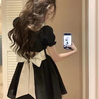 フランス バブル袖 ワンピース レディース 夏新作 Aライン ショート丈 リボン 半袖ワンピース