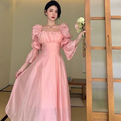 春夏新作 バブル袖 ワンピース レディース スクエアネック デザイン 甘い 可愛い Aラインワンピース