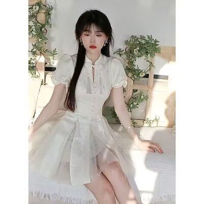 チャイナドレス レディース 改良 着痩せ チャイナ風 ワンピース フリンジ バブル袖 ウエスト引き締め ショートドレス