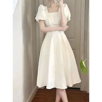 ホワイト バブル袖ワンピース レディース 着痩せ フランス ウエスト引き締め スリム見え スクエアネック ロングドレス
