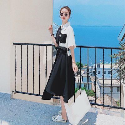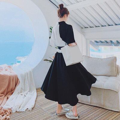 おしゃれ コントラストカラー ワンピース 着痩せ レディース ウエスト引き締め スリム見え イレギュラー 半袖 ロングドレス