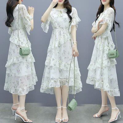 シフォン 花柄ワンピース 夏新作 着痩せ レディースファッション ウエスト引き締め セミロング 半袖ワンピース