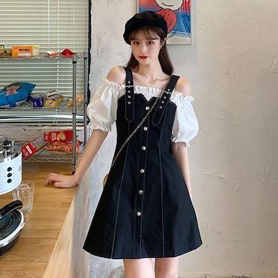 新しい ボートネック ワンピース 着痩せ レディース バブル袖 フェイクレイヤード 半袖 サロペットスカート