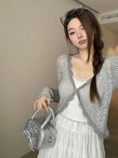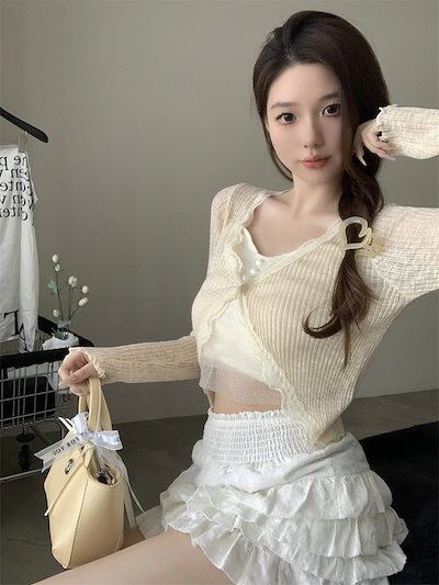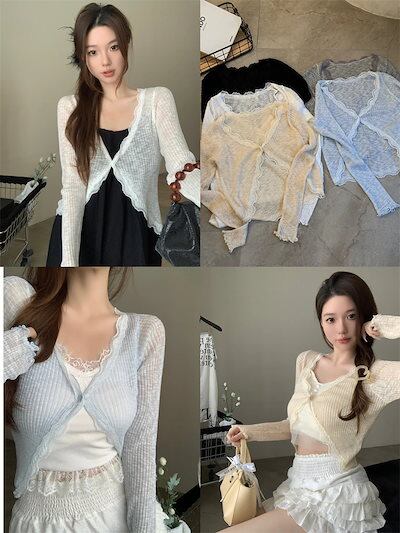 2024 春夏 ショート丈 薄手 カーディガン トップス 長袖 着痩せ 紫外線対策 UV対策 羽織り加工 きれいめ ライトニット オフィス OLネックカジュアルフレンチフェミニンファッション韓国レディ
