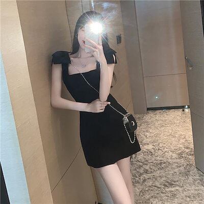 フランス リボン ノースリーブワンピース ブラック 着痩せ ウエスト引き締め ショートワンピース パーティードレ