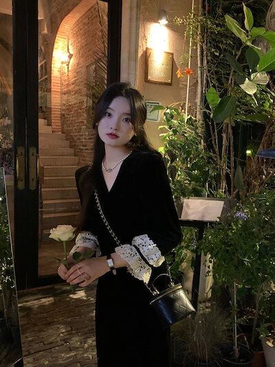 ブラック Vネック ロングドレス レース切り替え 着痩せ ワンピース セクシー ウエスト引き締め スリット マーメイドスカート