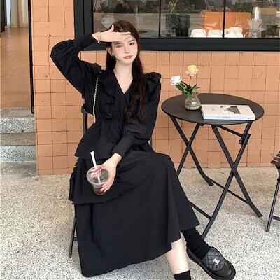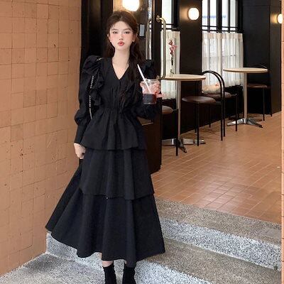 ヘップバーン風 Vネック ロングドレス 着痩せ フレンチ 高級感 ウエスト引き締め 長袖ワンピース おしゃれ 気質 パーティードレス