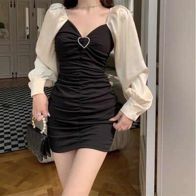 ワンピース レディース フェイクレイヤード Vネック タイトスカート 長袖 ウエスト引き締め 着痩せ パーティードレス