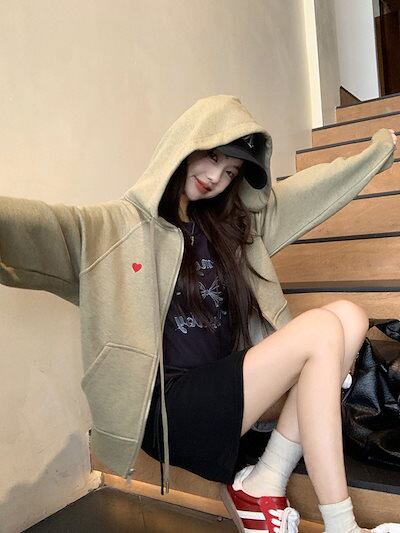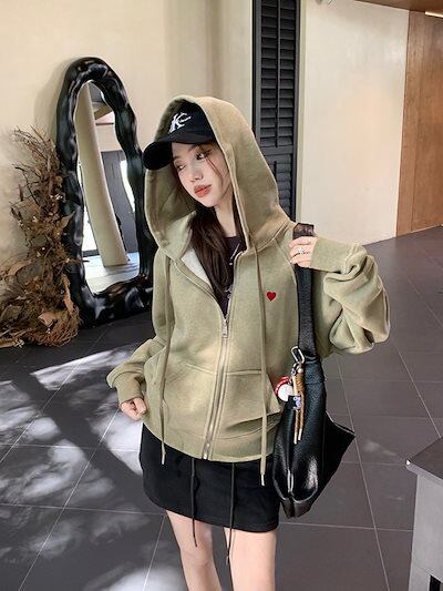 2024 秋冬アウター パーカー フード付き ジップ チャック 長袖 花柄 ポケット ハート 細見え 秋 緑 カーキ おしゃれ かわいい ガーリー キュート 甘め 韓国ファッション レディース お出か
