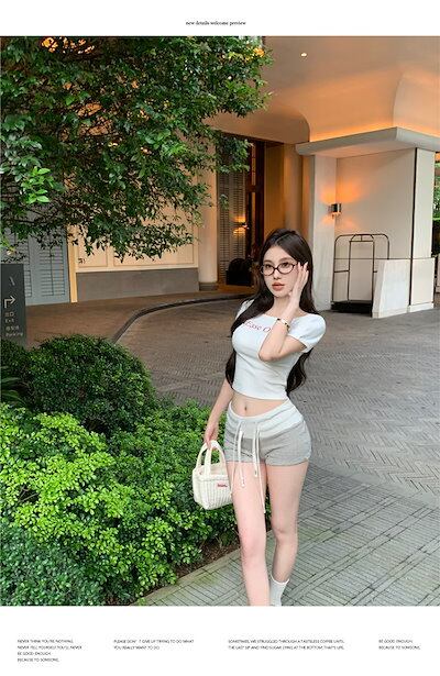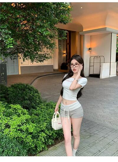 2024 春夏 甘い トップス Tシャツ ラウンドネック丈 休日 フレンチ プリント 韓国 ブラウス ファッション系 タイト スリムフィット丈短め半袖 ショートレディースへそ出し休日おしゃれT