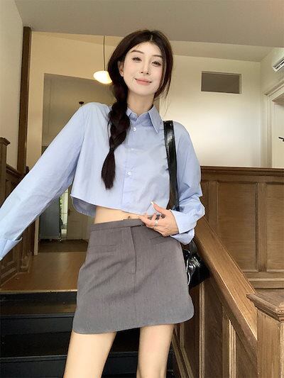2024夏トップス シャツ 長袖 ボタン 襟 スタンダードカラー 丈短め 細見え 夏 ブルー 青 おしゃれ かわいい 韓国ファッション レディース お出かけ