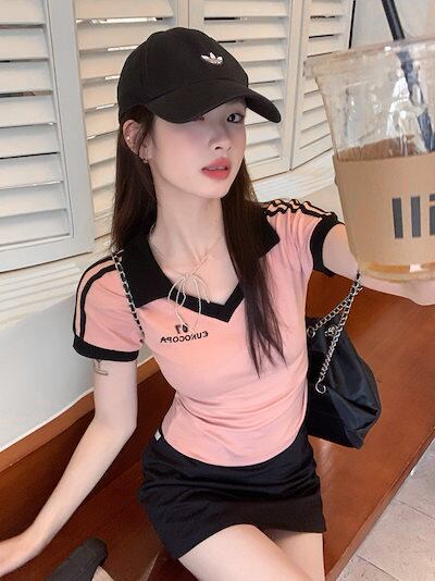 2024 春夏トップス 大人可愛い半袖 Tシャツ 韓国 ラウンドネックロゴスリム かわいいへそ出し ショート おしゃれスリーブ カジュアルサイドコーデ丈 ファッション系レディースストリートお出かけ T