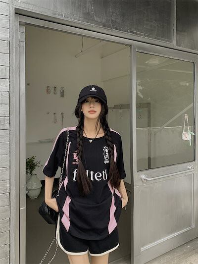 2024 夏 韓国 甘い 可愛い風トップス Tシャツ ファッション系半袖スリムフィットサイドペイントシルエットゆったり丈 休日レディースサイズ韓国Vネック おしゃれカジュアルメンズライク T