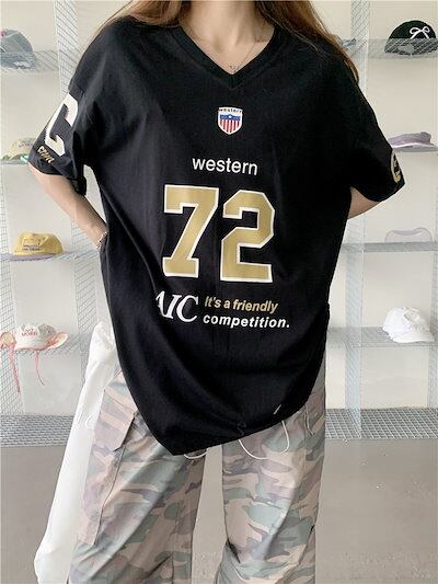 2024 夏 韓国可愛い風トップス Tシャツ ファッション系 半袖 スリムフィット サイド ペイントシルエットゆったり丈 休日レディースサイズ韓国Vネック おしゃれ カジュアル メンズライク T | Jeannede ジャンヌデ