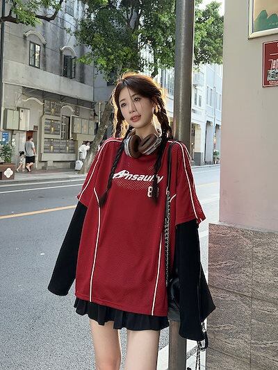 秋 韓国可愛い風トップス Tシャツ ファッション系 長袖 フェイクレイヤード サイド 重ね着シルエットゆったり丈レディース韓国サイズおしゃれ カジュアル メンズライク T