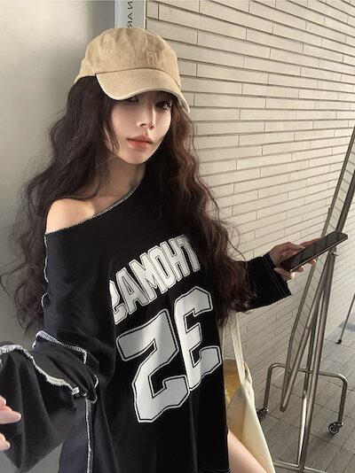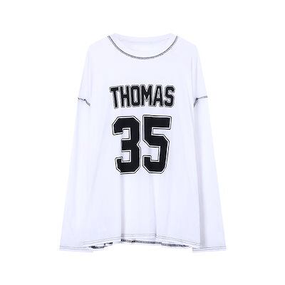 秋韓国可愛い風トップス Tシャツ ファッション系 長袖 プリント ルーズ サイド ペイントシルエットゆったり丈 レディースサイズ韓国Vネック おしゃれ カジュアル メンズライク T