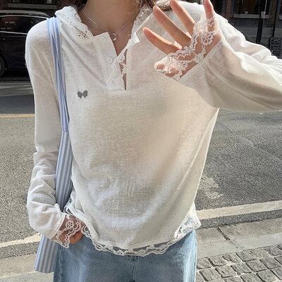 2024夏トップス Tシャツ 長袖 薄手 フード付き レース ゆったり 細見え 夏 白 おしゃれ かわいい 韓国ファッション レディース お出かけ