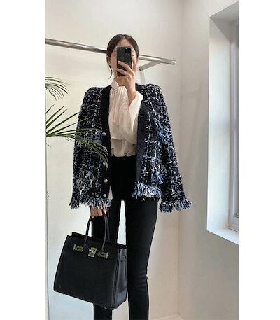 ジャケット レディース カジュアル ツイードジャケット ノーカラー カーディガン ショート丈 トップス 長袖 フェミニン 大人カジュアル おしゃれ お洒落 デイリー ママ 服 お出かけ オフィス