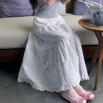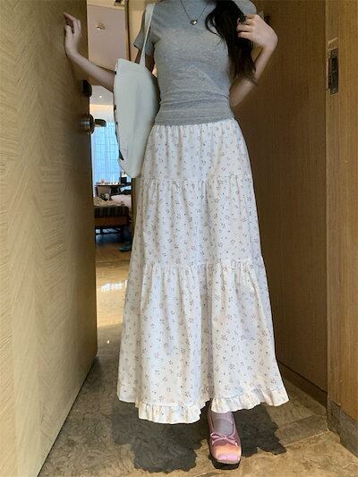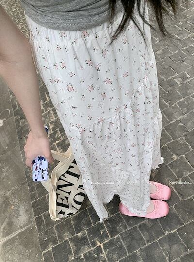 2024 春夏スカート Aライン ロング丈 花柄 バラ ピンクの花 ハイウエスト 美脚効果 脚長効果 細見え 夏 白 ホワイト 韓国ファッション レディース かわいい おしゃれ ガーリー 甘め カジュ