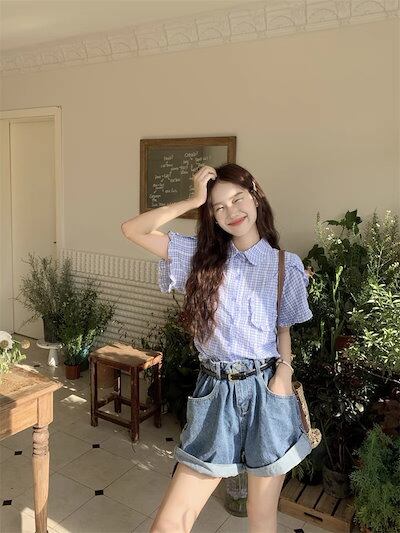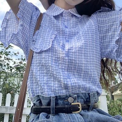 2024 春夏トップス シャツ 半袖 ボタン 襟 スタンドカラー ゆったり ギンガムチェック柄 夏 青 かわいい おしゃれ ガーリー 甘め カジュアル 韓国ファッション レディース お出かけ