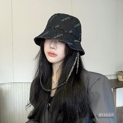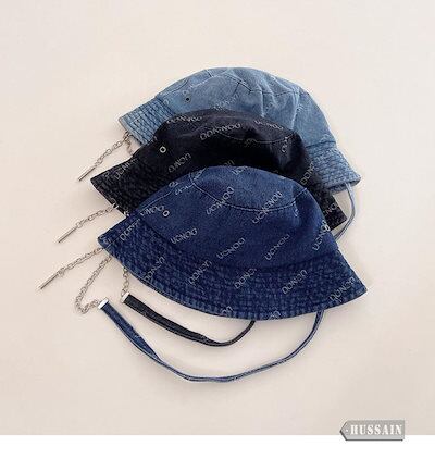 デニム ロゴ チェーンストラップ バケットハット 帽子 サファリハット アウトドア レジャー UV対策 紫外線対策 日焼け対策 韓国ストリート カジュアル メンズライク