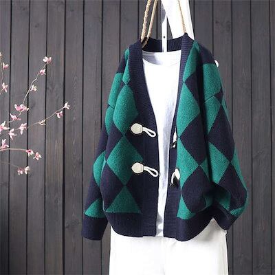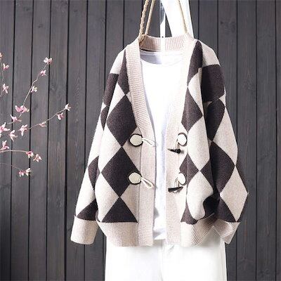 カーディガン セーター ニット 秋冬 厚手 トップス 菱柄 幾何学柄 レディース Vネック アウター ミディアム丈 トグルボタン 前開き 秋冬コーデ 羽織り 長袖 ニットカーディガン レディース ゆっ
