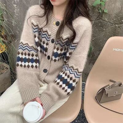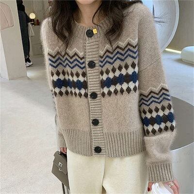 ニットカーディガン レディース 長袖 秋 冬 カーディガン 幾何柄 セーター ゆったり 厚手 丸首 ニットトップス ショット丈 もこもこ アーガイル ドロップショルダー 前開き フロントボタン ノルデ