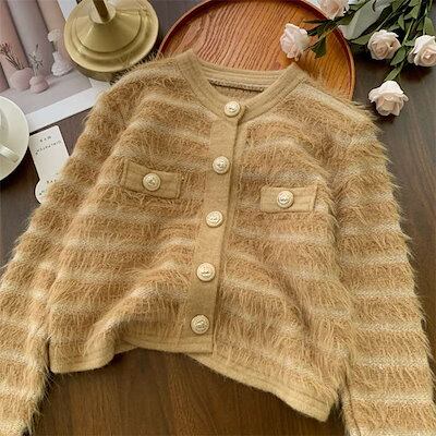 カーディガン レディース 春 秋 冬 ニットカーディガン 長袖 トップス ニット 羽織 アウター ジャケット ノーカラージャケット ショート丈 暖かい アウター 前開き 防寒 シャギーニット 体型カバ