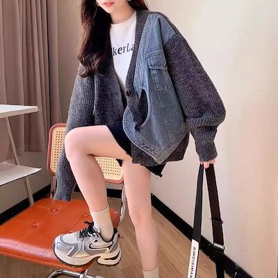 ニットカーディガン ニットカーディガン 厚手 デニム 切り替え ダブルブレスト AWアウター 冬アウター 裏起毛 ダウンジャケット アウター ロングコート ダウンジャケット ジャケット コート レディ