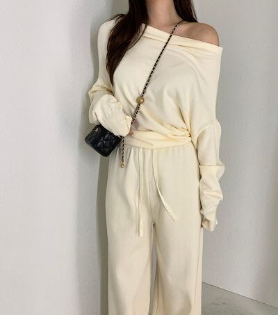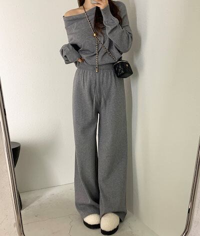 2024秋冬セットアップ トップス ニット長袖 ワンショルダー ロングパンツ ワイド ストレート ゆったり 秋 白 黒 おしゃれ かわいい 韓国ファッション レディース お出かけ