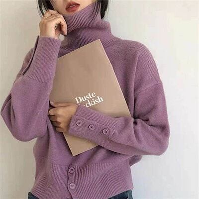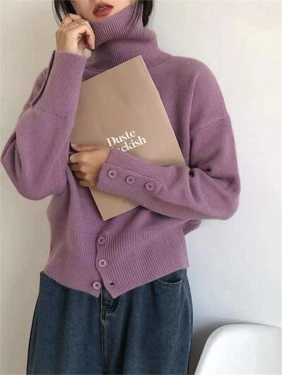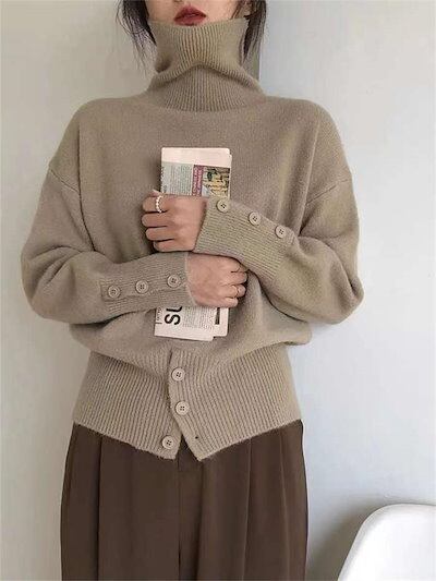ニット セーター レディース 秋 冬 長袖 ハイネック トップス 無地 ボダン付き タートルネック お洒落 プルオーバー シンプル 通勤 OL ゆるシルエット カジュアル 防寒 あったか 体型カバー